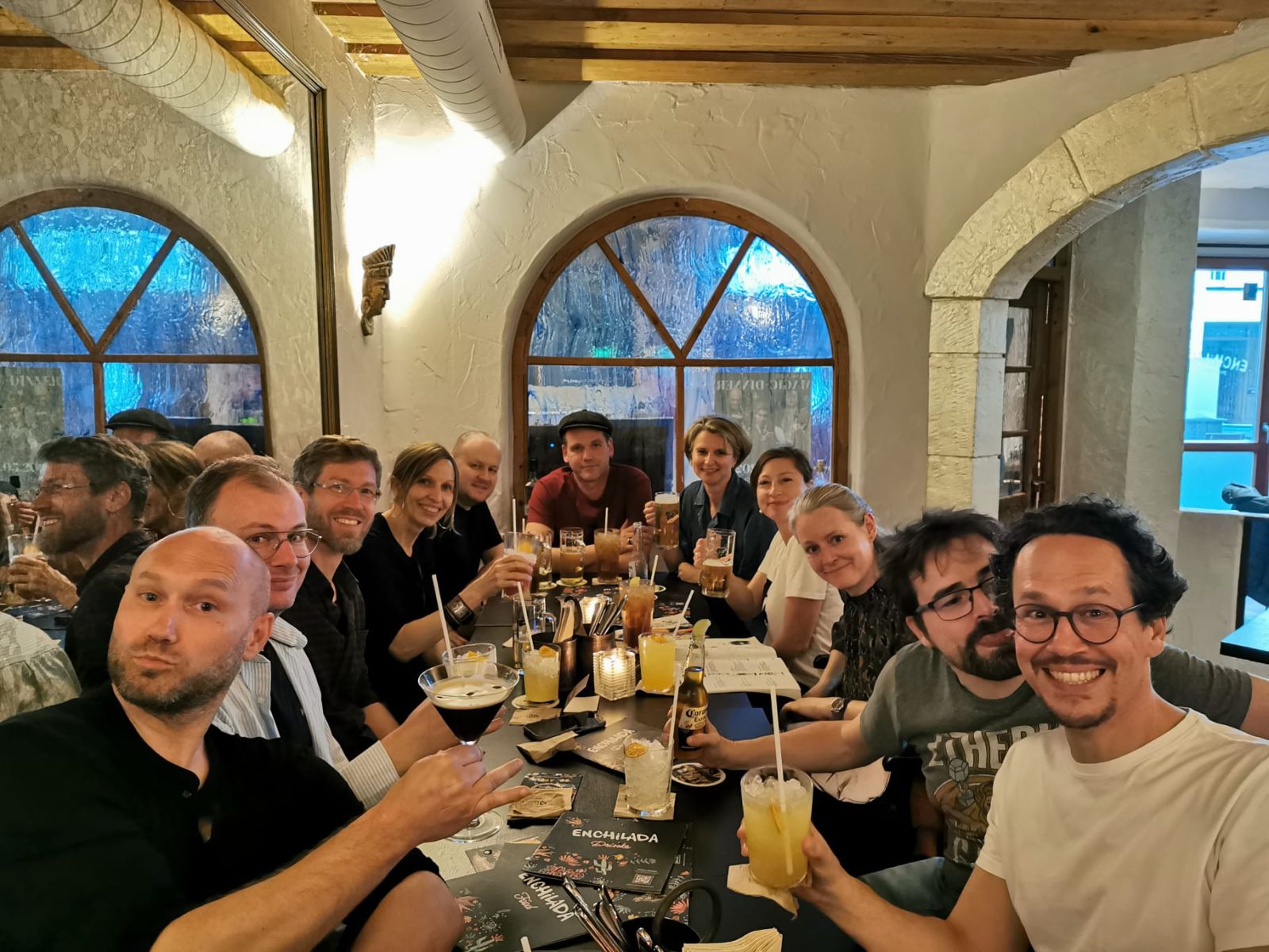 Danach gings zum Karo. Dort standen schon vor dem Eingang einige „alte“ Mitschüler. Was echt geil war, war dass wir uns so lange nicht gesehen hatten, aber irgendwie alle erkannten. Mein Gott, war die Zeit damals schön. Diese Unbeschwertheit und diese Freiheit. Wir gingen zwar durch die neuen Schulräume, aber wieder erkannt hätte ich sie nicht. Aber so viel Aufmerksamkeit konnte ich ihnen gar nicht geben, da ich mit all den Leuten, die ich eben 25 Jahre lang nicht mehr gesehen hatte, redete. Was richtig cool war, war dass das Gefühl aufkam, dass man uns einfach so wieder in die Klassenräumen setzen konnte und wir wieder denselben Spaß hätten wie damals. Das war einfach genial. Nach der schönen Rundführung mit Finale in der Aula, die heute viel kleiner wirkte als damals, ging es für uns Richtung Enchi (mittlerweile beim Mailkeller). Dort hockten wir uns rein und es kamen noch weitere Leute, wie Geri, dazu. Ich wechselte immer mal wieder den Platz, quatschte mit allen und wir schwelgten in Erinnerung. Ein harter Kern blieb dann am Ende übrig und wir gingen noch Richtung Irish Pub, neben dem Jägerstüberl bzw. das war sogar das alte Jägerstüberl. Dort gönnten wir uns noch das letzte Bier bevor ich mit Gicht langsam wieder zurück zum Matthias ging. Hier fielen wir nur ins Bett und ich hing meinen Gedanken hinterher. So viel Veränderung….so viel Altes.