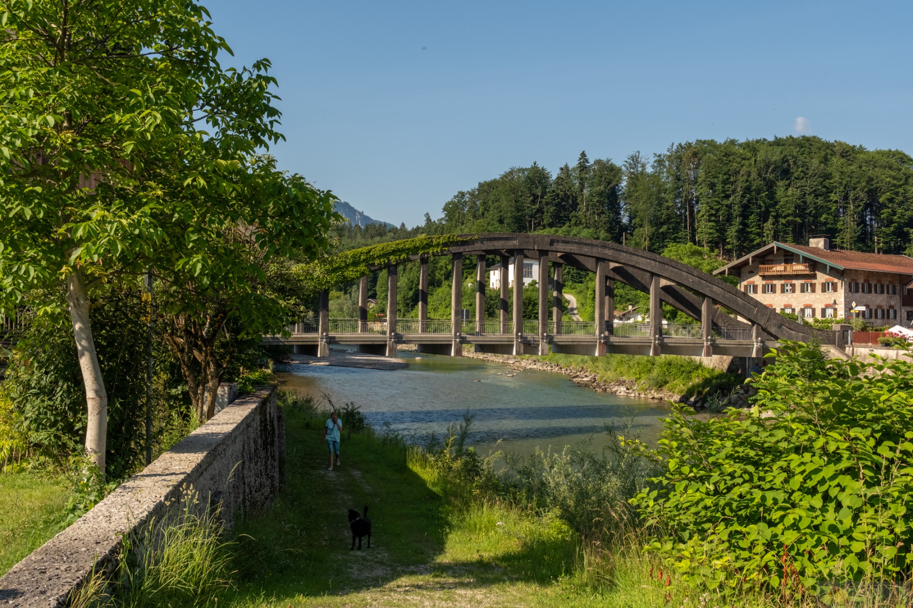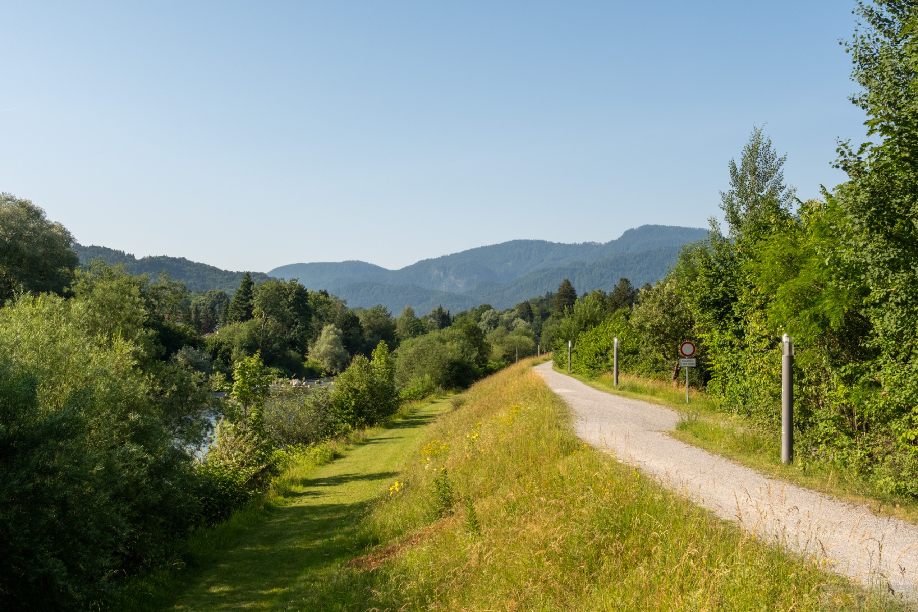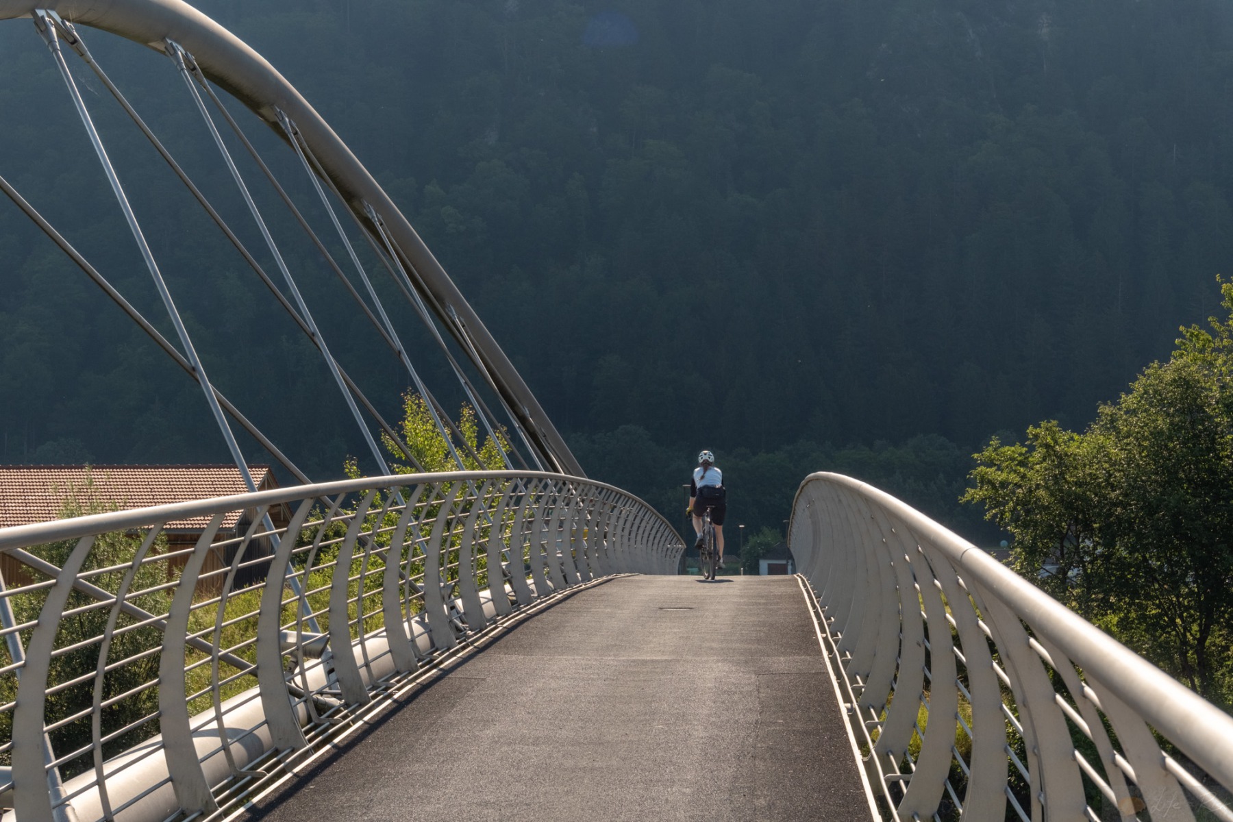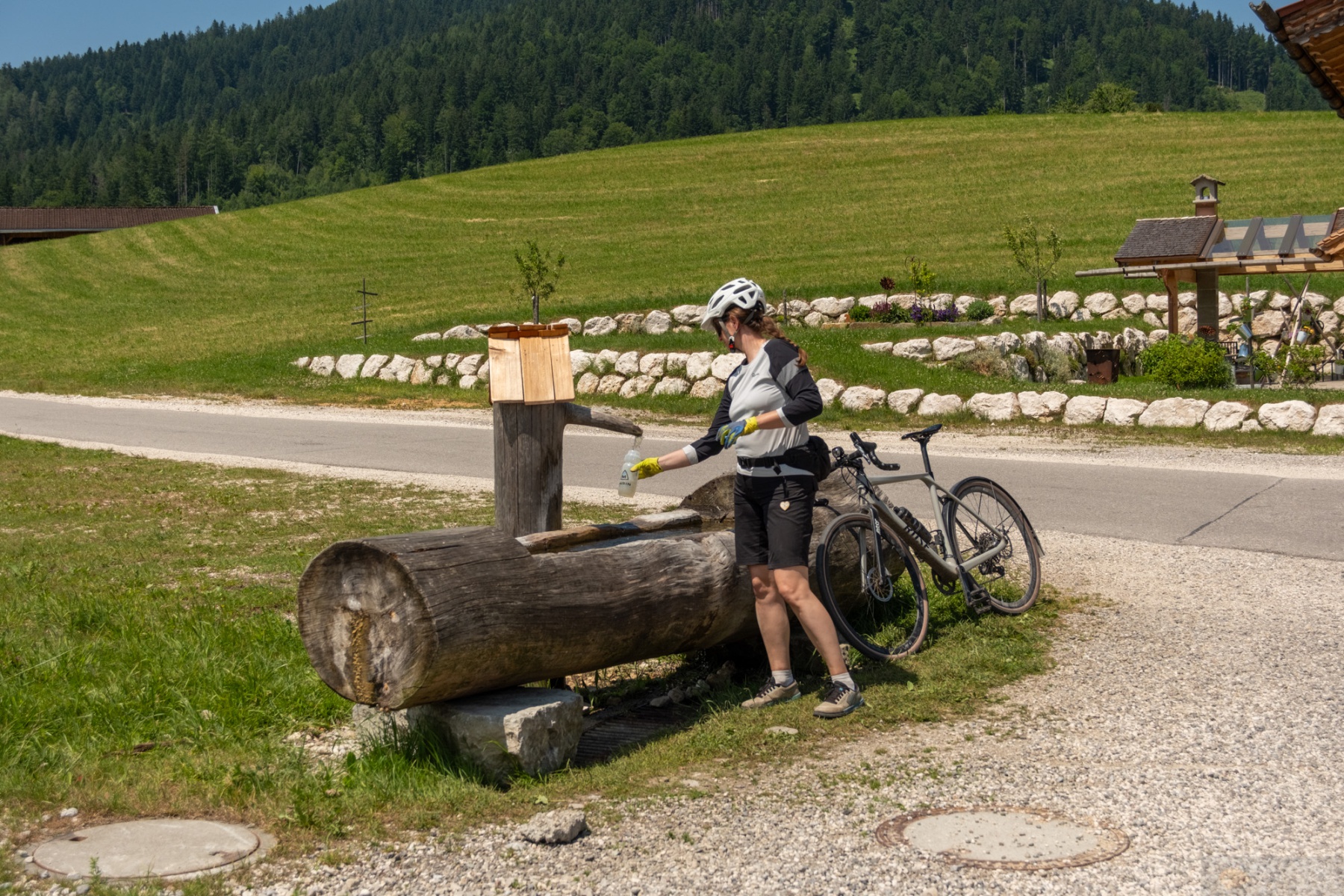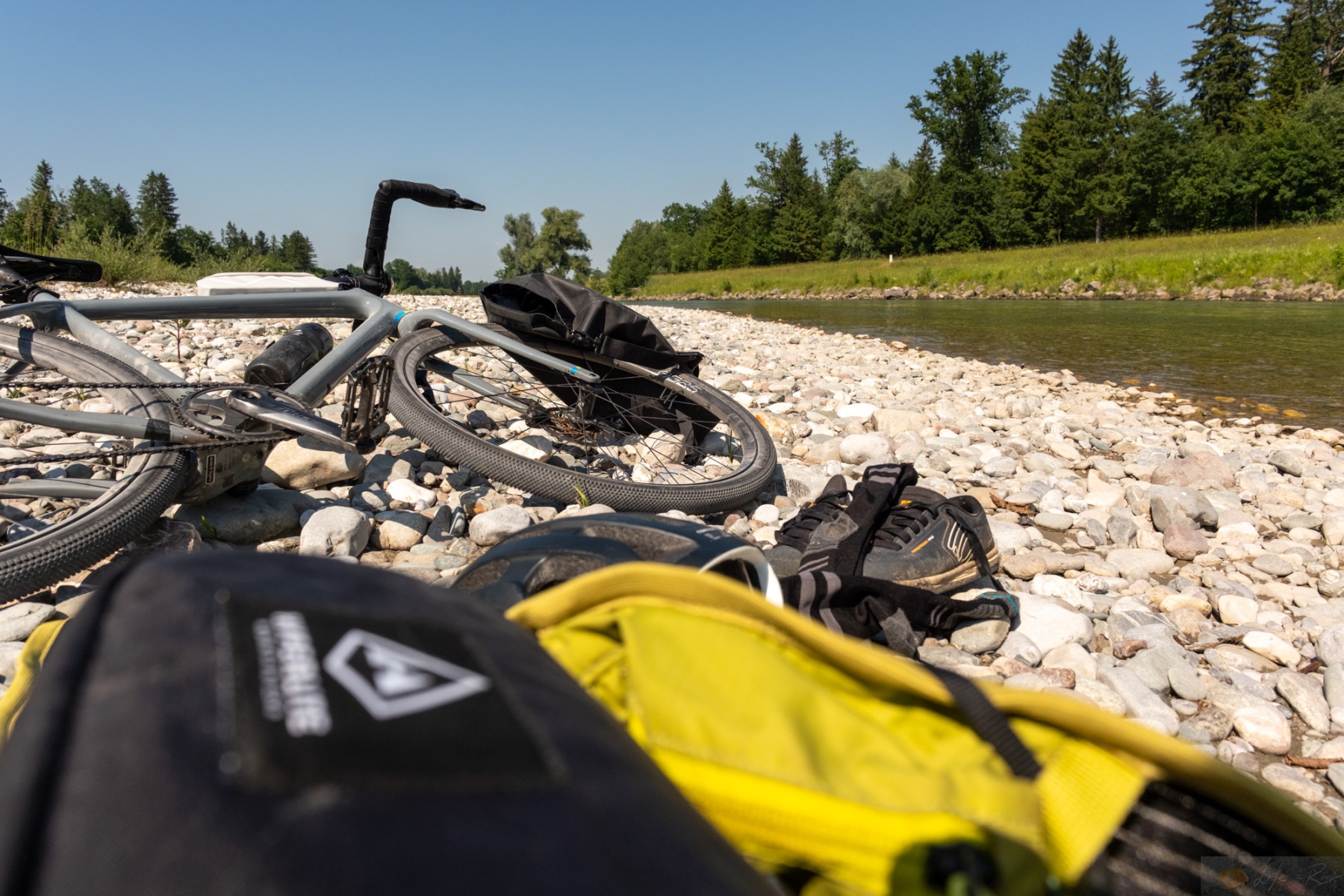 In der Früh ging es bei angenehmen Temperaturen los. Mal wieder dieses ewig geile Gefühle so ohne Stress von zu Hause aus loszufahren…einfach genial. Wir wärmten uns bis Bernau gemütlich auf und von hier ging es dann über kurze Schotterwegs-Passagen nach Grassau und weiter nach Marquartstein. Von hier wurde der Trail etwas wild. Wir folgten noch der Tiroler Ache und dann wurde es ab Unterwössen ein „wir versuchen jedes Stück Schotter mitzunehmen“ Trail. Irgendwie war es auch witzig, da in den Dörfern lokale Sommerfeste liefen und die Leute in Tracht unterwegs waren. Dann wir mit den Gravelbikes und Radel-Klamotte. Wir zogen den Daxenberg hoch und erst dann wurde es etwas ruhiger, da wir zum Masererpass die Landstraße fuhren. Von hier ging es Schuss runter nach Reit im Winkel und dann von hier über einen schönen Schotterweg am Schwarzlofer Bach entlang bis zum Seegatterl. Hier machten wir dann das erste mal Pause. 37km von 110 und knapp die Hälfte der Höhenmeter waren bis hierhin geschafft. Naja..so richtig wohl fühlte ich mich nicht, wenn ich noch an den Rest dachte. Mit schön müden Beinen gings weiter. Der Weg an den Seen vorbei war eine Art Höhenweg, der immer auf und ab führte. Leider trafen wir dann am Bürgl eine Gruppe Senioren-E-Biker, die nicht abwärts fahren konnten. So überholten wir sie im Downhill und im Uphill überholten sie uns. Was noch nerviger war, dass sie trotz ihrem „reifen“ Alter sich nicht verkneifen konnten Sprüche in unsere Richtung los zu lassen, so nach dem Motte E-Bikes sind schon besser und wir sind toller. Wahnsinn. Irgendwann nervte es mich so sehr immer in diesem Pulk zu fahren, vor allem weil viele von ihnen so Plastik-Radl-Shirts trugen und dann halt nach Schweiß stanken, dass wir stehen blieben und kurz Pause machten. Leider holten wir sie dann wieder ein. Das ganze endete dann damit, dass wir sie vor Ruhpolding am Biathlon Zentrum endgültig überholten. Einer von denen war auf dem Schotter gestürzt, wohl mit Beteiligung einer anderen Person. Ich fragte noch nach ob ich helfen könnte, aber die regelten das alles schon selber. Um so besser. Ab dem Biathlon Zentrum fuhren wir dann durch ein richtig schönes Waldstück. Das erinnerte mich fast an Schottland oder an Slowenien. Ein richtig schöner dichter Wald, dazu ein kleiner Bach und ein wunderschöner Trail. Perfekt. Ruhpolding war dann so schon nach Mittag. Wir hatten Hunger. Wir sondierten kurz die Lage und entschieden uns dann für die Pizzeria am Golfplatz. Leider hatte die zwar offen, aber noch kein Essen: Grr. So tranken wir unsere bestellten Getränke und fuhren dann Richtung Inzell zu unserem letzten Anstieg. Dieser führte uns erneut die Straße entlang, was etwas kräfteschonender war. Wir umrundeten den Froschsee und kehrten dann spontan an der Kessel-Alm ein. Hier ergatterten wir noch einen letzten Platz und gönnten uns die verdiente Currywurst mit Pommes. Herrlich. Aber nach dem Essen aufzustehen und weiter zu fahren viel uns echt schwer. Zum Glück gings von hier ab erst einmal Bergab. Die Landschaft selber, auch bis hierher war einfach herrlich. Richtig schöner Kitsch. Von Inzell aus führte es zwar noch über Felder entlang Richtung Siegsdorf, aber man merkte schon, dass man raus aus den Bergen war. Auch wenn diese Felder einfach ein schönes Sommerfeeling machen. In Siegsdorf wurde es dann wieder etwas wild und ab hier merkte ich meinen Einbruch. Mein Bein tat etwas weh und auch mein Körper hat gefühlt den Schalter gezogen. Die Hitze nahm auch deutlich zu und all das trug nicht unbedingt zu meinem Wohlbefinden bei. Wir kamen noch bei Bad Adelholzen vorbei und dann weiter bis nach Bergen, aber hier merkte ich, es geht nicht mehr. Insgesamt fiel ich in ein Loch. Ich sah Leute vom Hochfelln aus mit dem Gleitschirm runterfliegen und mir wurde in dem Moment bewusst, dass das alles bei mir noch ewig dauern würde. Dazu noch die Erschöpfung und gefühlt der Kampf gegen den eigenen Körper. Da machte der entsprechend zu. So bequatschte ich kurz mit Laura was wir machen sollten. Sie war noch fit und so entschieden wir uns, dass sie nach Hause fährt und das Auto holt. Ich würde entweder irgendwo warten oder langsam weiterfahren soweit es ging. So zog sie weg und ich machte mich langsam auf. Ich kam noch bis zum Chiemsee und verfranste mich dann komplett bei Übersee. Ich bog hier einmal falsch ab, dachte es geht schon, landete in einer Sackgasse, dann wieder zurück. Ich merkte auch, dass mein Hirn überhitzte. Ich brauchte Abkühlung. Entscheidungen fielen mir echt schwer. So fuhr ich an der Tiroler Ache entlang und als ich ein schönes Stückchen fand machte ich halt und sprang rein. Das kühle Wasser tat gut. Ich kam etwas runter und fühlte mich besser. Danach fuhr ich langsam weiter bis nach Grassau und kehrte dort in einem Biergarten ein, wo ich dann auch auf Laura wartete. Sie kam ca. eine halbe Stunde später und holte mich ab. Boah…krasse Tour bzw. interessante Erfahrung so einen Einbruch zu haben. Generell ist das Thema Hitze einfach nicht außer auch zu lassen. Aber mega. Endlich wieder das Gefühlt gehabt zu haben, dass es bisschen voran geht, auch wenn ich einen emotionalen Dipp am Ende hatte. Es wird schon!