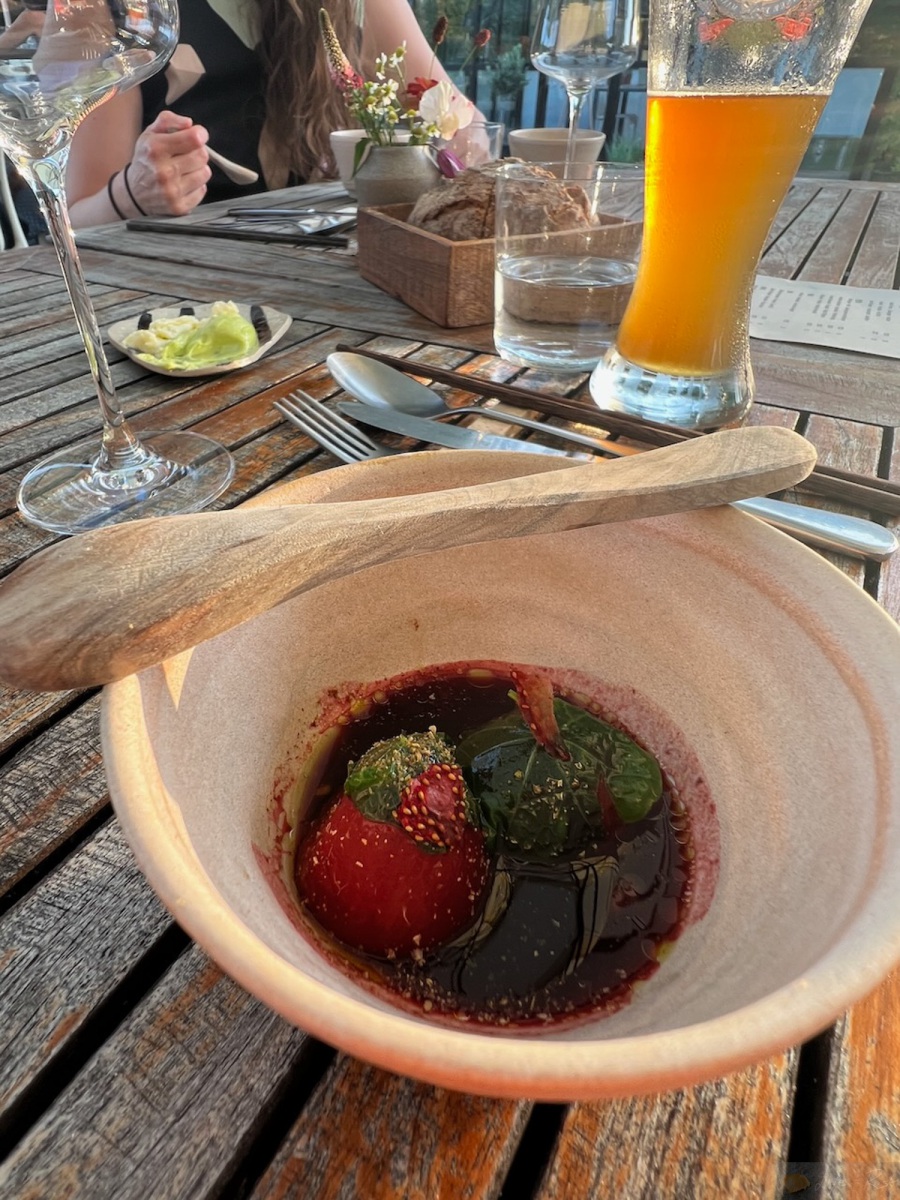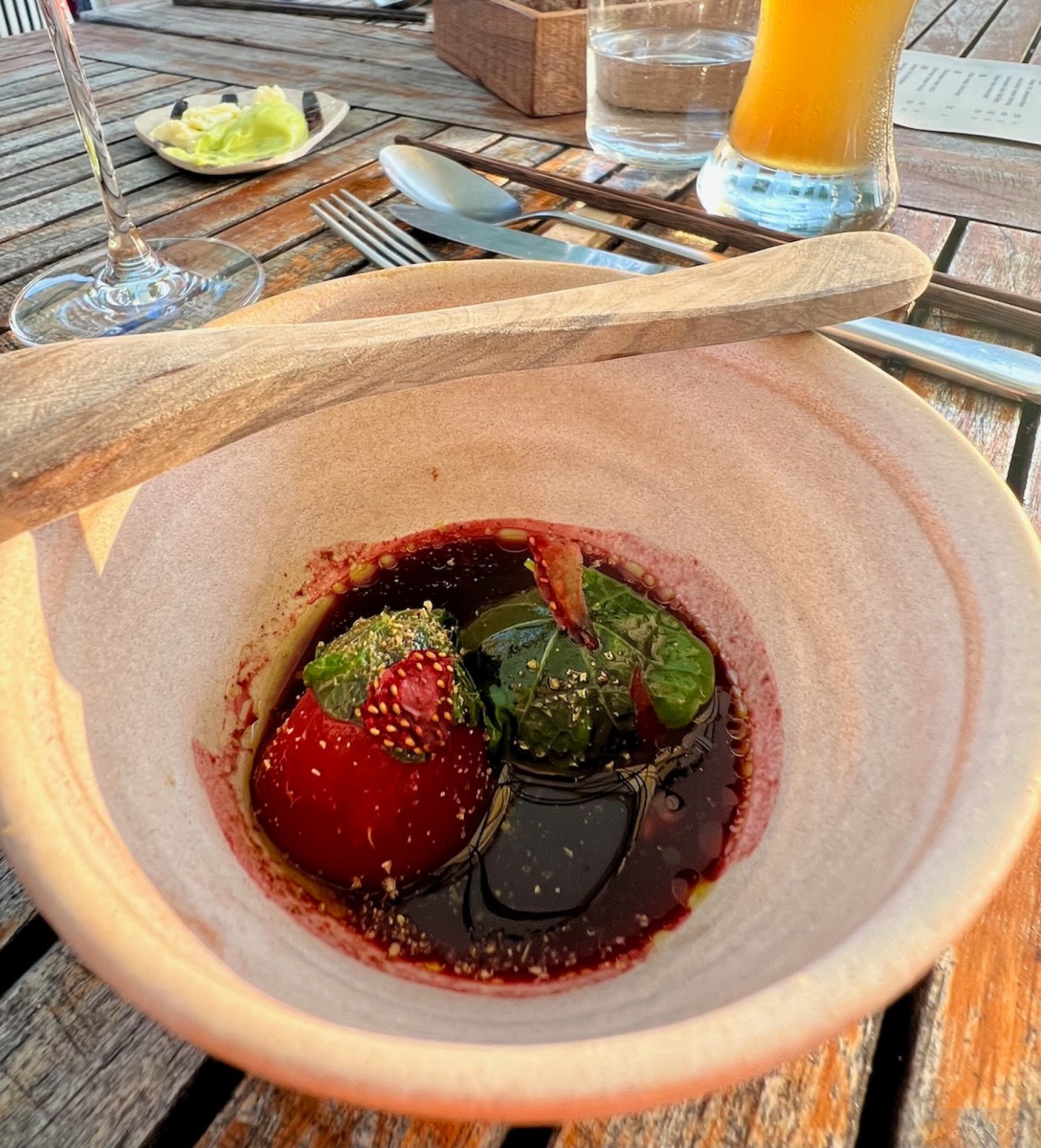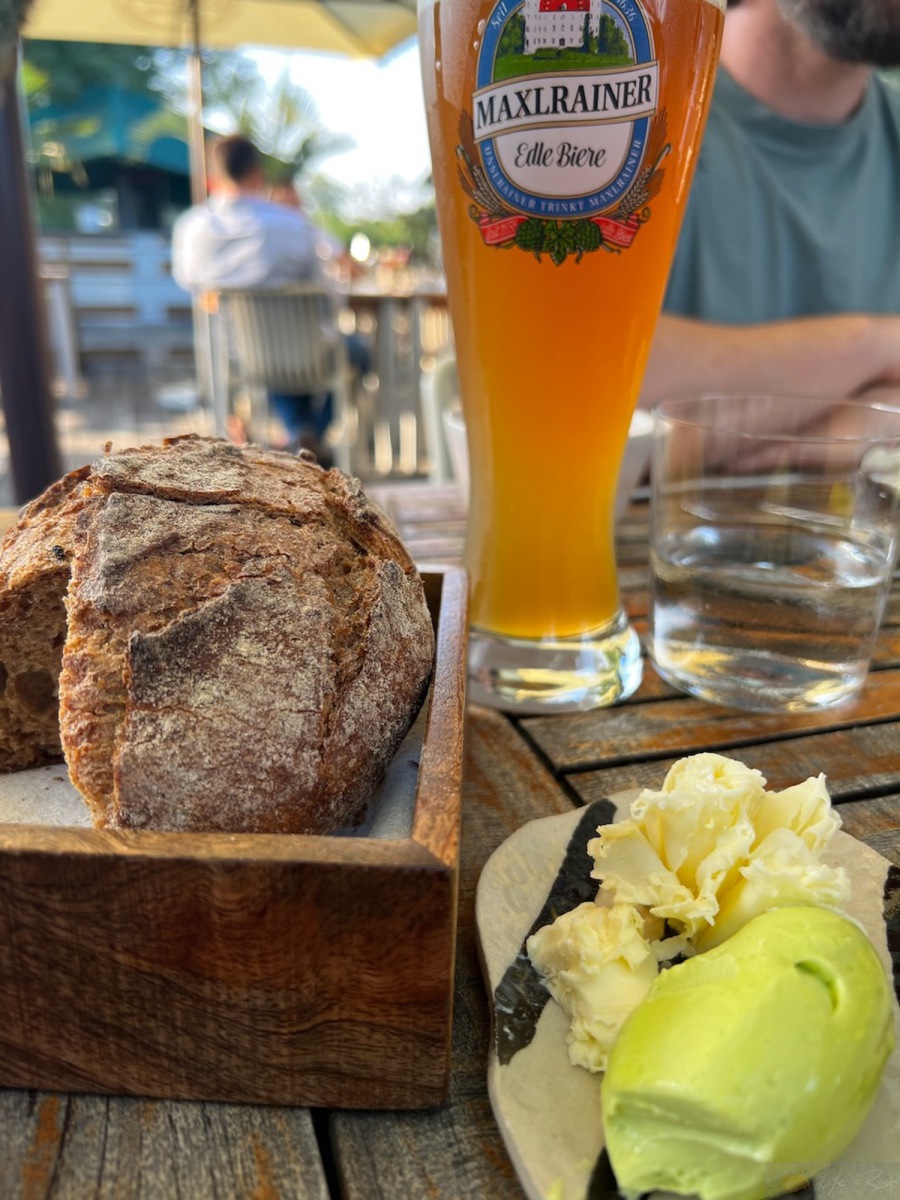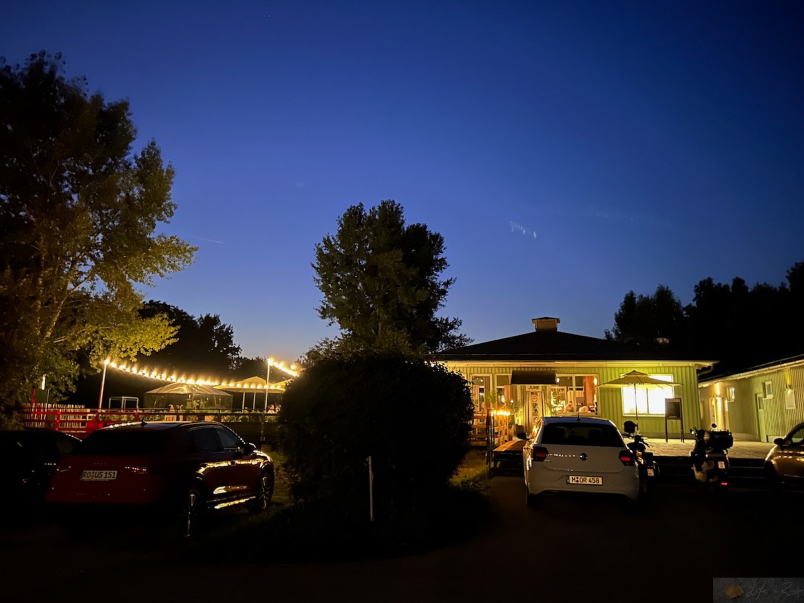 Bis zum Abend erholte ich mich einigermaßen gut, so dass wir uns dann ready machten um Sabine abzuholen. Dann ging es mit ihr ins June. Einem schönen Restaurant bei Übersee, welches viel regionale Küche machte und zuletzt sogar mit einem Stern geehrt wurde. Die Stimmung bzw. der Abend war genial. Es roch überall nach dem frisch gemähten Gras (auch wenn es mir heute zum Verhängnis wurde) und die Sonne tauchte alles ein schönes pastellfarbenes Licht. Am June angekommen setzten wir uns auf die Terrasse und genossen den Abend. Das Restaurant war in einem alten Bootshaus gebaut worden und es passte einfach perfekt zum Abend. Das Essen selber war sehr gut. Es traf zwar nicht immer 100%. unseren Geschmack, aber die Finesse und auch die Überraschungseffekte waren durchaus kreativ. So wurde der Salat in einer Frischhalte-Marinade serviert, bestehende aus Essig und Wasser und nachdem man das Salatherz daraus gegessen hatte wurde es mit Gin aufgegossen und man hatte ein weiteres Getränk. Auch der Rest war mega gut und wie gesagt einfach etwas besonders. Der Abend verging, die Mücken kamen, das Autan wurde gezückt, die Mücken gingen, gutes Essen kam, kaltes Bier blieb. Herrlich. Trotz dem beschissenen Tag war es ein wunderschöner Abend und ein toller Abschluss. Ich glaube Sabine hat es auch gefallen. Auf dich.