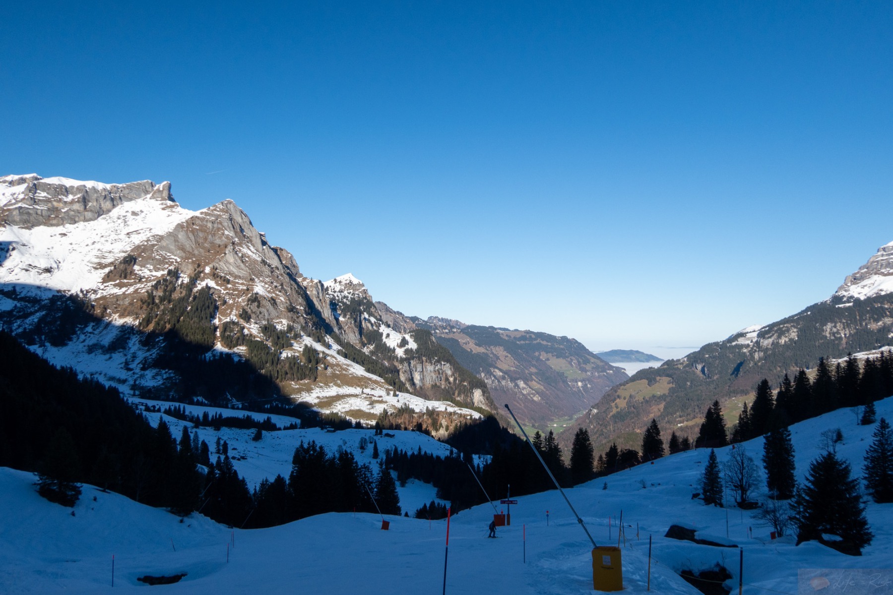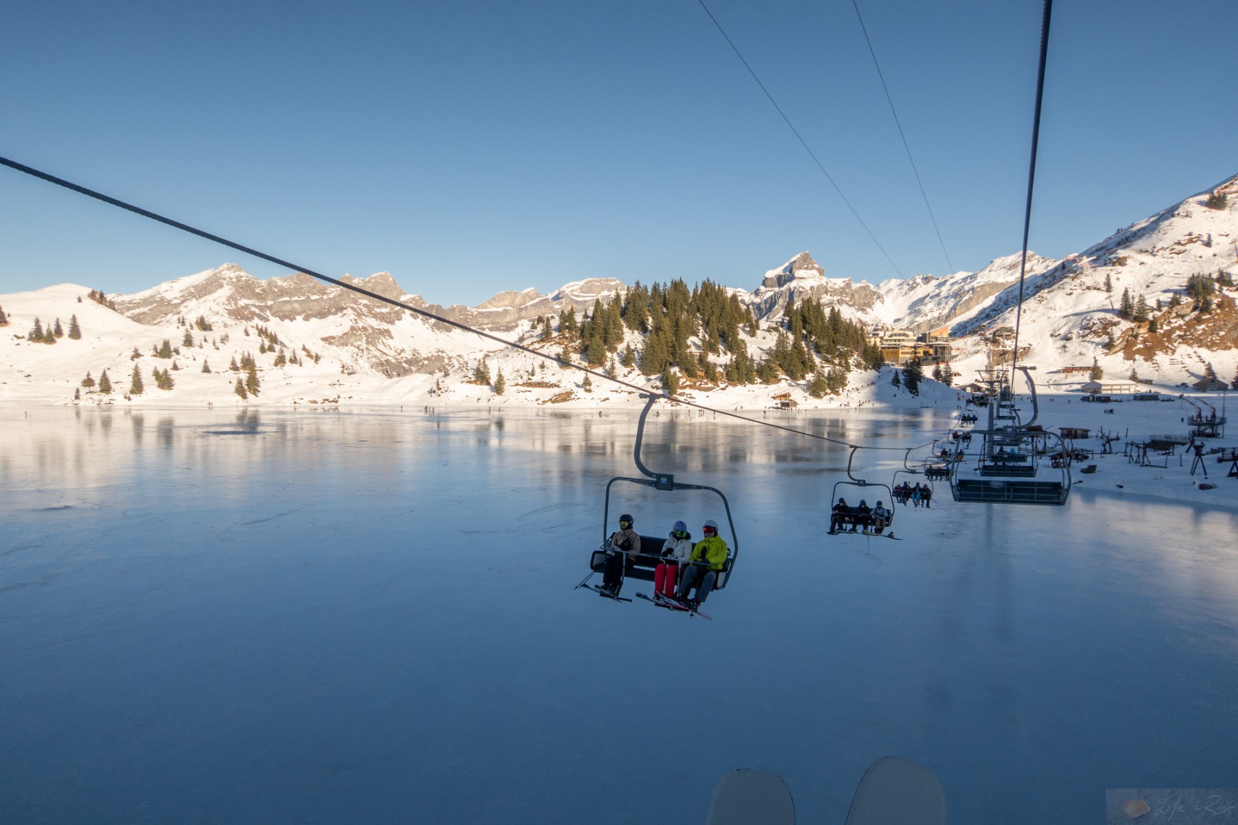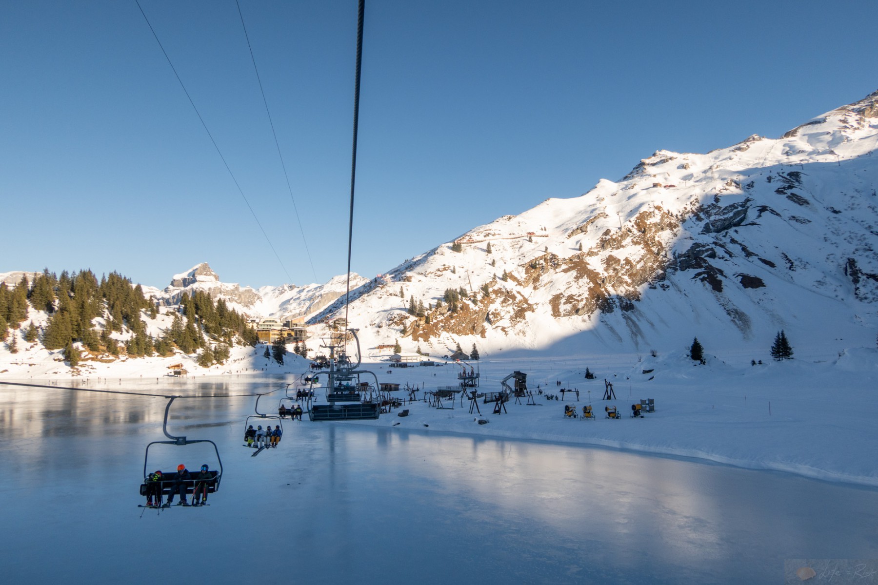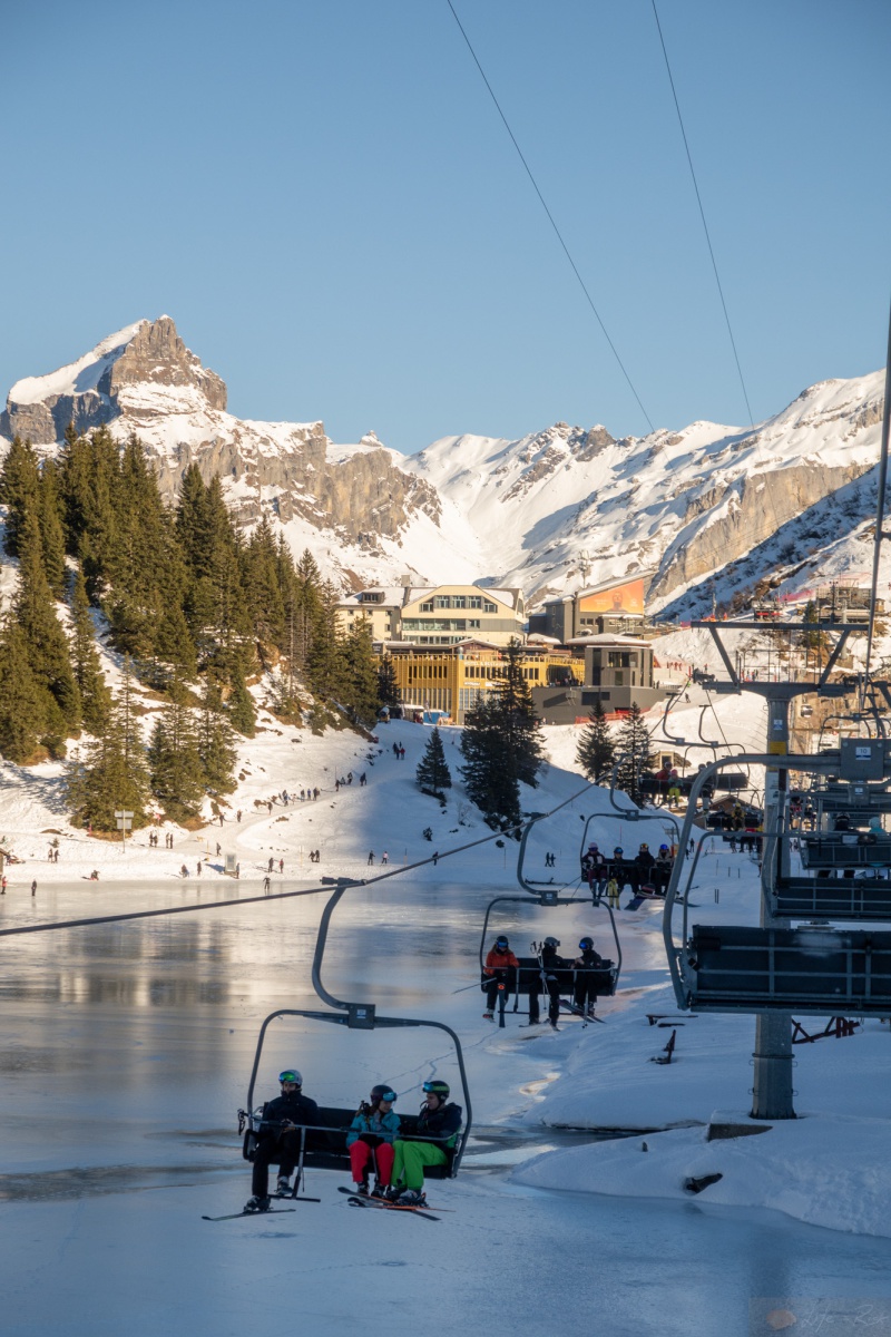 Heute wollte ich es wissen. Ja, der Schnee war nicht mehr wirklich da, aber auf der Nordseite mehr als genug um eine Pistenskitour zu gehen. So fuhr ich mit dem Bus zur Talstation während Laura zur Brunni hoch lief um zu fliegen. Der erste Abschnitt ging wie beim letzten Mal. Tatsächlich ganz gut. Ich mochte das neue Setup und genoss sogar den Ziehweg hoch nach Untertrübsee. Das Kanonenrohr stellte mich dann kurz vor eine Herausforderung, nicht wegen der Steilheit sondern mehr, weil der Schnee fast nur der Kunstschnee war und dieser sich einfach nicht richtig verband und mehr nach unten rollte als hielt. Ich war aber nicht allein. Einige Skifahrer hatten auch ihre Probleme und schnallten sogar auf der Umfahrung vom Kanonenrohr ab und liefen dann runter. Verrückt. Ich selber merkte hier schon deutlich die Ausdauer. Ich war halt nix mehr gewohnt. Nach dem Kanonenrohr musste ich eine kurze Pause machen, die aber ob dem Schatten und der Kälte echt kurz ausfiel. Ich erreichte dann nach dem Endstück das „Flachstück“ bis zum Trübsee und tatsächlich war ich zwar fertig, aber es ging mir besser als gedacht. Ich zog das Stück noch durch und blickte immer wieder hoch auf die Bergspitzen..irgendwann wird’s wieder gehen. Es war eine verrückte Mischung. Einerseits wollte ich nicht zu viel darüber nachdenken, andererseits war ich zwischen Bangen und Hoffnung. Am Ende hatte ich es selber in der Hand. Ich musste einfach nur weitermachen. So motiviert erreichte ich ohne weitere körperliche Probleme den Lift und fellte ab…Geil. Die erste „ernsthafte“ Skitour seit dem Unfall. Es war ein schöner Tag, somit war die Aussicht hier oben schon geil, aber wie gesagt, es fehlte brutal an Schnee. Dafür war der Trübsee vereist und die Leute fuhren Schlittschuhe drauf. Schon auch geil. Das große Sulz hingegen war schon eher traurig. Aber es fanden sich doch ein paar Skifahrer, die runter kamen. Nächstes Jahr wieder, denn dieses Jahr fand ich die „Abfahrt“ von Skilift zur Gondelstation schon herausfordernd. Boah..ich war froh dann doch wieder in der Gondel runter zu sitzen, ohne Verletzung und es dennoch geschafft zu haben.