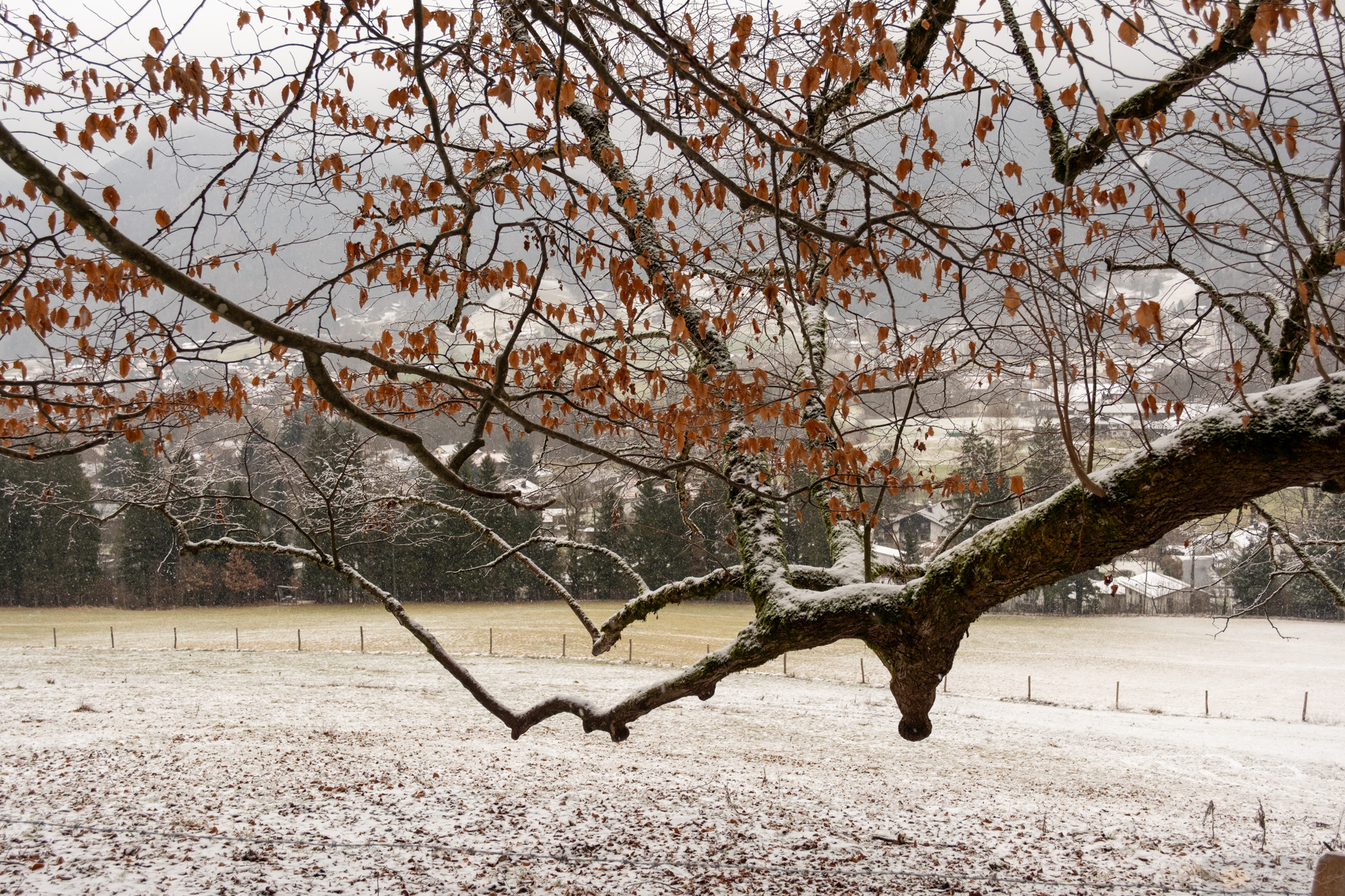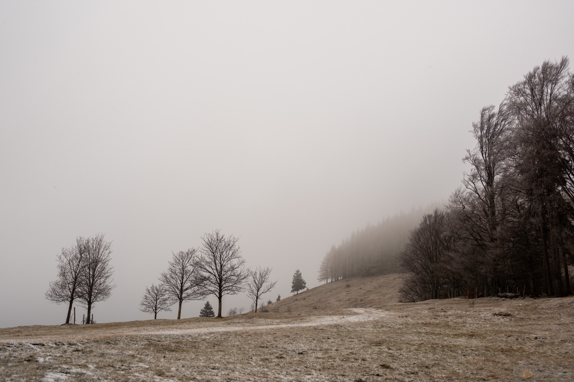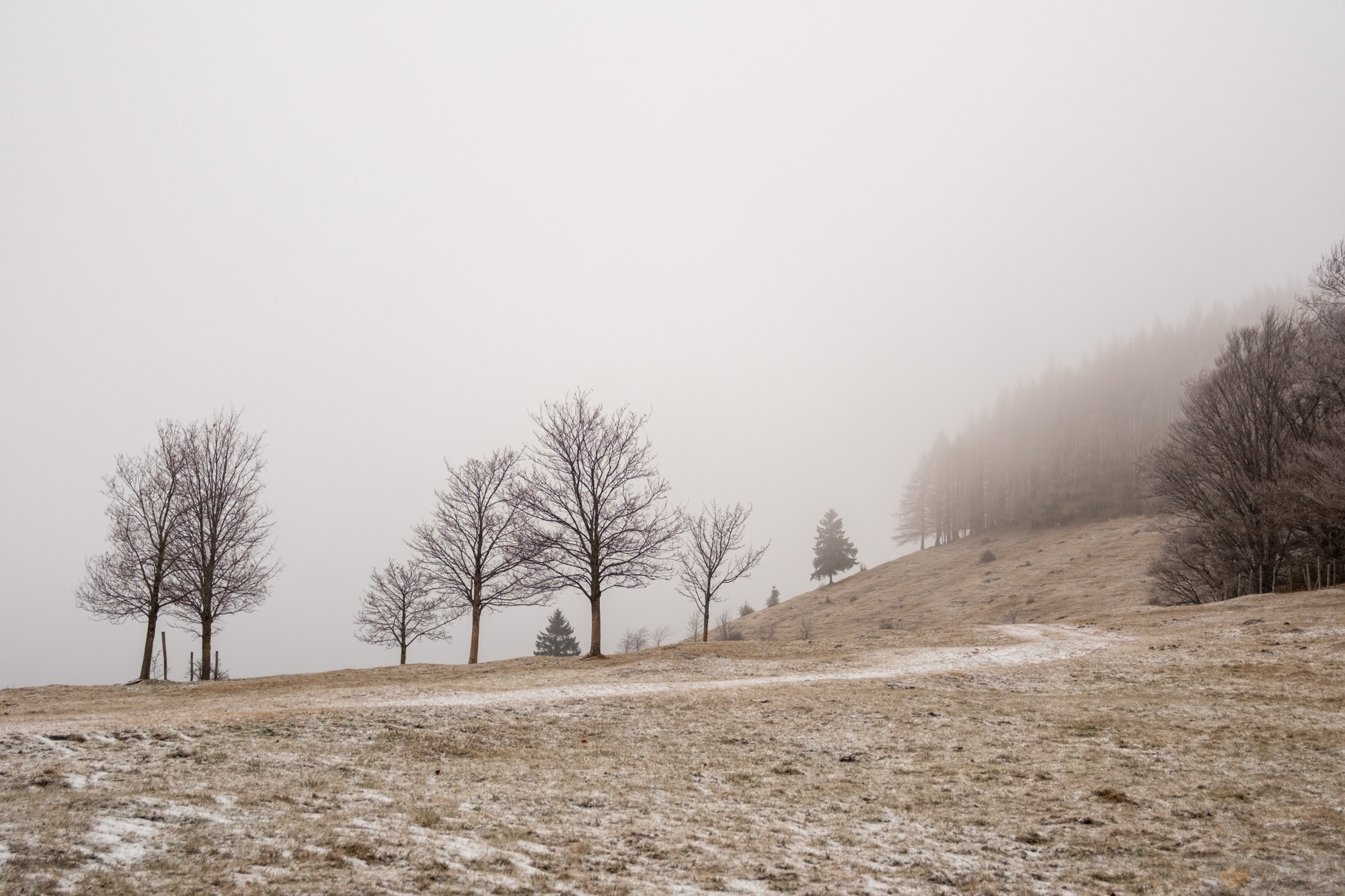 Irgendwann zog es uns doch raus..und ja, genau dann als der Schnee kam. Die Tage davor war es trocken (wie seit über einem Monat) und genau heute wo es schneite wollte ich raus. Aber die Stimmung war mega. Wir spazierten zur Hofalm hoch und es fühlte sich gut an. Die Luft crisp, der Wind kalt aber rein. Oben an der Hofalm war vom Schnee von damals nicht viel übrig. Nur den Nordwind spürten wir. Aber wie gesagt, die tiefen Wolken, der leichte Schneefall…ich mag diese gedämpfte Stimmung. Es ist nicht nur alles irgendwie leiser und langsamer, auch die Farben sind etwas gewichen…einfach faszinierend diese Zeit.