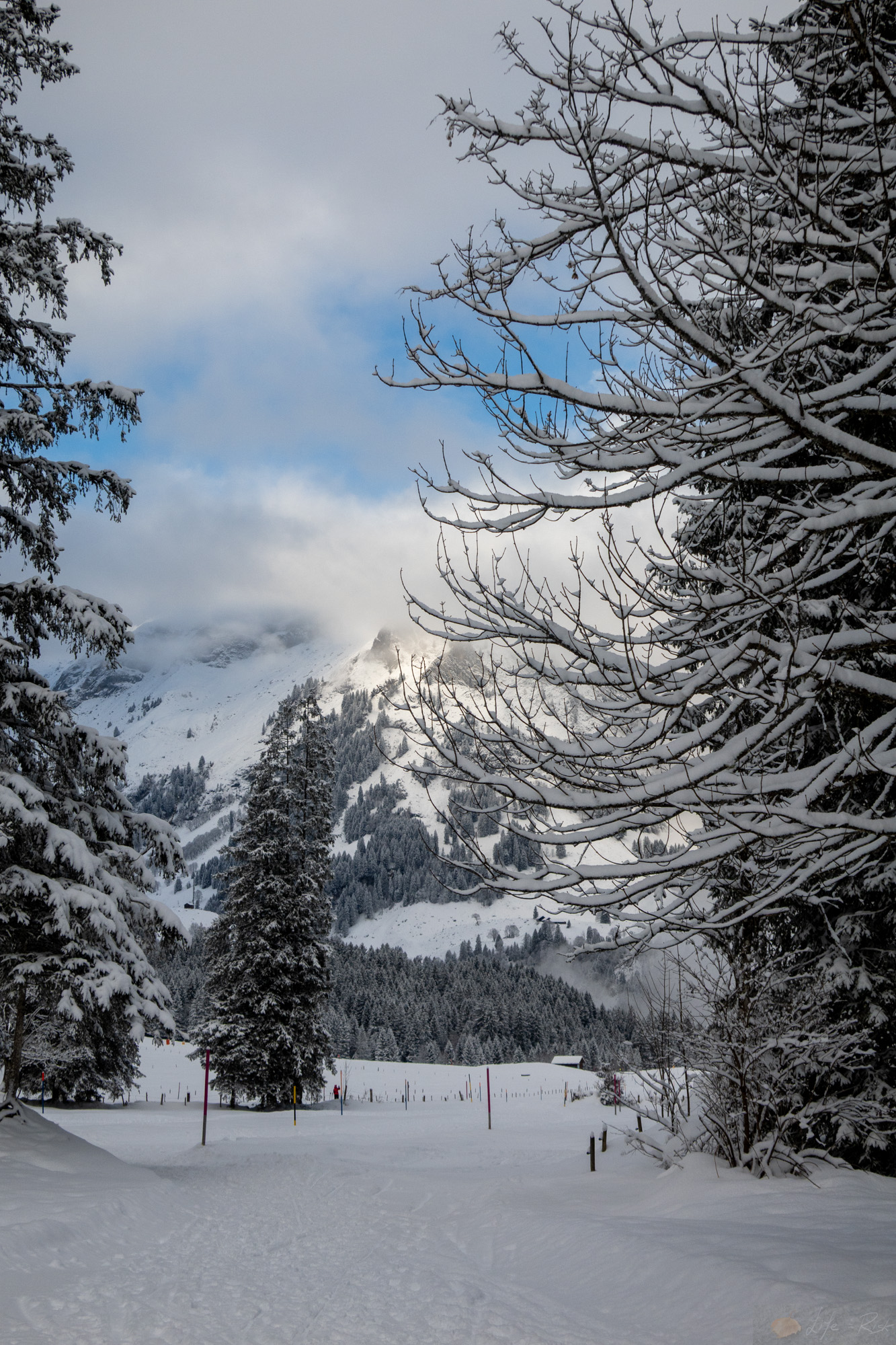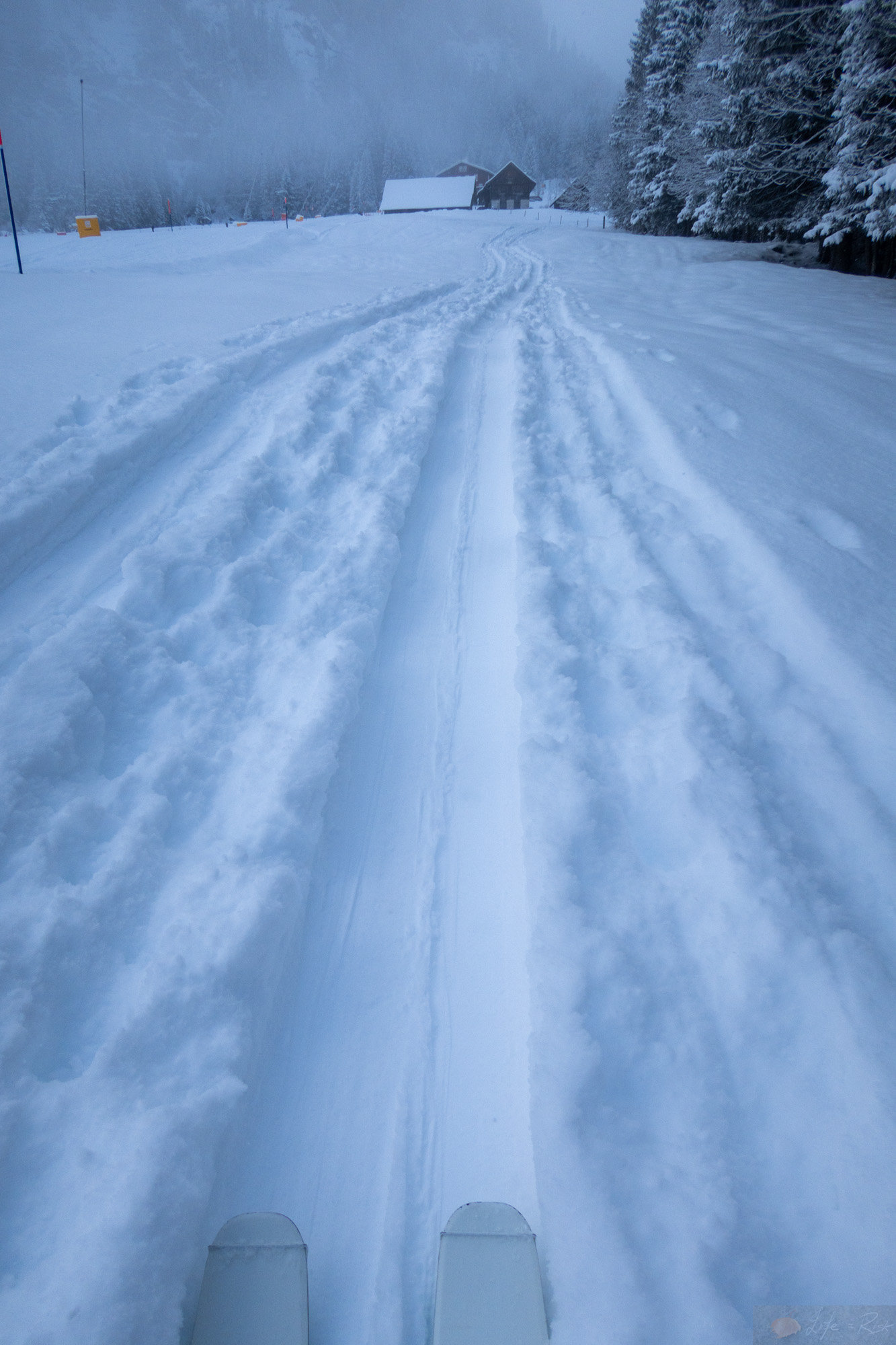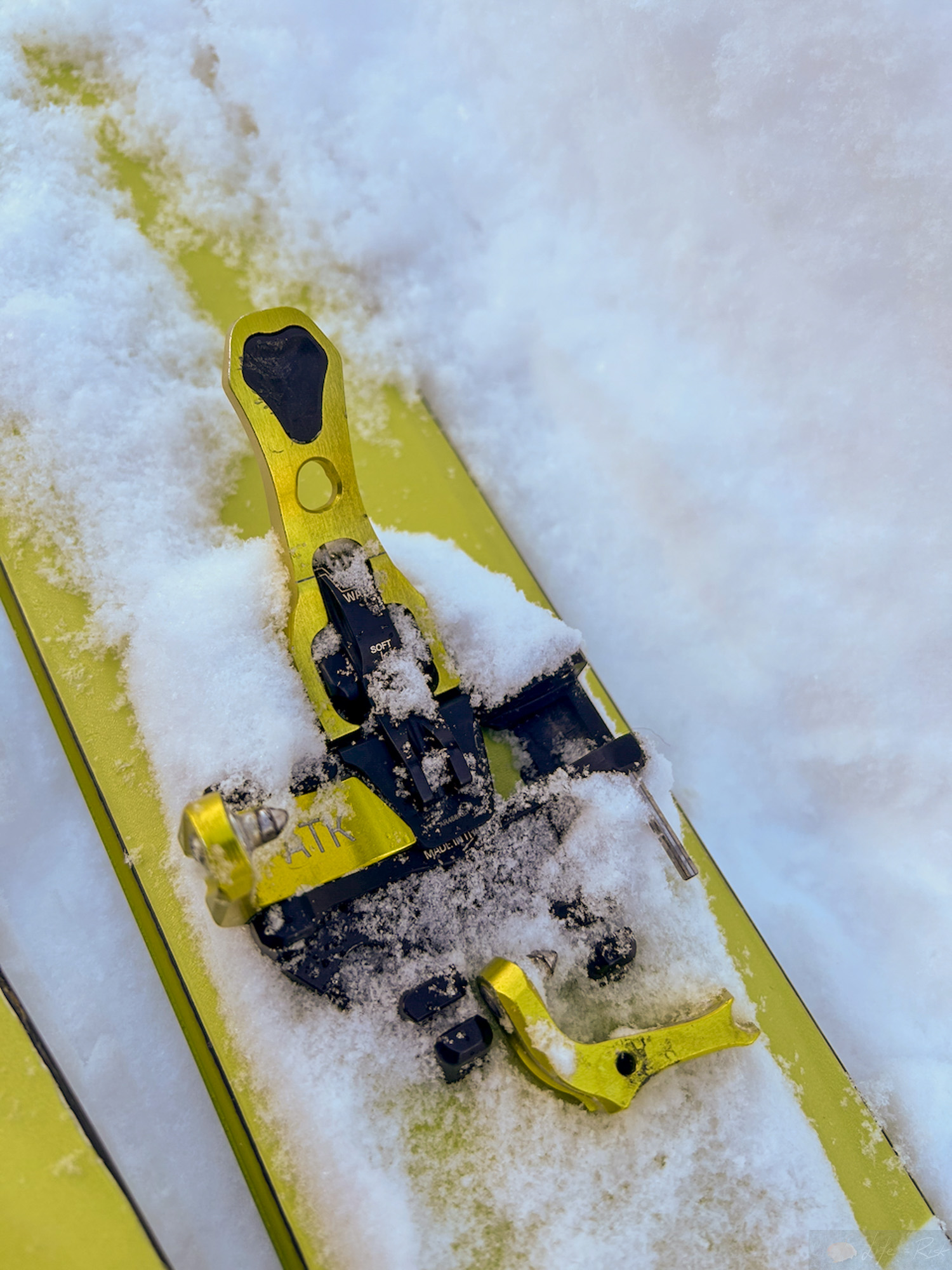 Am Samstag nutzen wir beide das schöne Wetter und die 15cm Neuschnee. Laura ging zum pisteln und ich machte mich auf zur Skitour. Der Weg über die Talabfahrt war schon bekannt und es hatte endlich genug Schnee, dass ich die Abkürzung durch den Wald gehen konnte. Es war einfach schön. Es fühlte sich nach einer richtigen Skitour an. Powder links und rechts und dann das monotone Gestampfe. Herrlich. Unterhalb von Untertrübsee wich ich komplett auf die Wiese neben der Piste aus und schon bald nahm ich diese gar nicht mehr wahr. Es war wirklich wie komplett auf Skitour sein. Es ging alles gut, ich hatte keine Schmerzen, es machte Spaß als plötzlich mein rechter Fuß ohne Ski voll nach vorne schoss. Häh? Ist die Bindung aufgegangen? Ich schaute nochmal genauer hin und nein..äh ja. Die Bindung hatte sich gelöst, aber nicht der Sperrmechanismus sondern die rechte Backe hatte sich komplett verabschiedet. Der Stift, der diese noch drin hielt steckte noch, aber die Backe war draußen. Grrrr. Manchmal…manchmal hasse ich es. Ich versuchte gefühlt eine halbe Stunde lang den Splint wieder rein zu bekommen…keine Chance. So packte ich alles ein, die Ski auf den Rucksack und stapfte dann runter zur Langlauf-Loipe und weiter bis zur Gerschnialp-Bahn. Was ein scheiß. Unten angekommen ging ich sofort zum nächsten Skiladen, der ATK Bindungen reparieren konnte und kam gleich zu einem Experten. Der meinte, das war noch die alte Variante, mittlerweile wird das anders gemacht. Also keine Chance. Muss man einschicken, denn zum einen wird die Bohrung sicher zu weit geworden sein und man braucht spezielles Presswerkzeug um den Stift wieder fest zu bekommen. Na geil. So kam ich frustriert am Wohnwagen wieder an. Während ich mich aufwärmte und was aß erzählte Laura von ihrem Tag (gute Piste, wenig los)…dann kam ihr die Idee ob ihr anderer Ski denn nicht auch mit meinem Schuh gehen könnte. Ich schaute nach und tatsächlich war ihre Bindung ganz vorne geschoben und ich konnte die 10mm locker nach hinten justieren. Perfekt. So war der Abend gerettet.