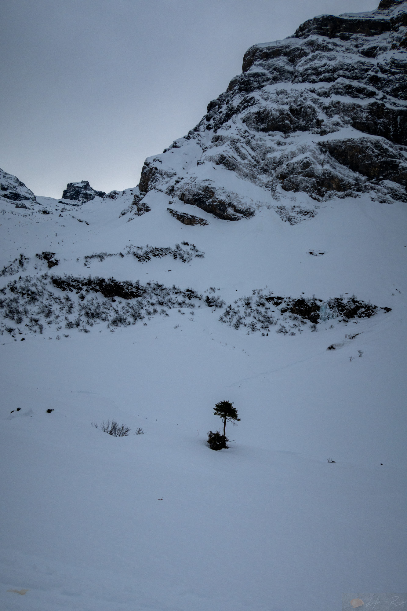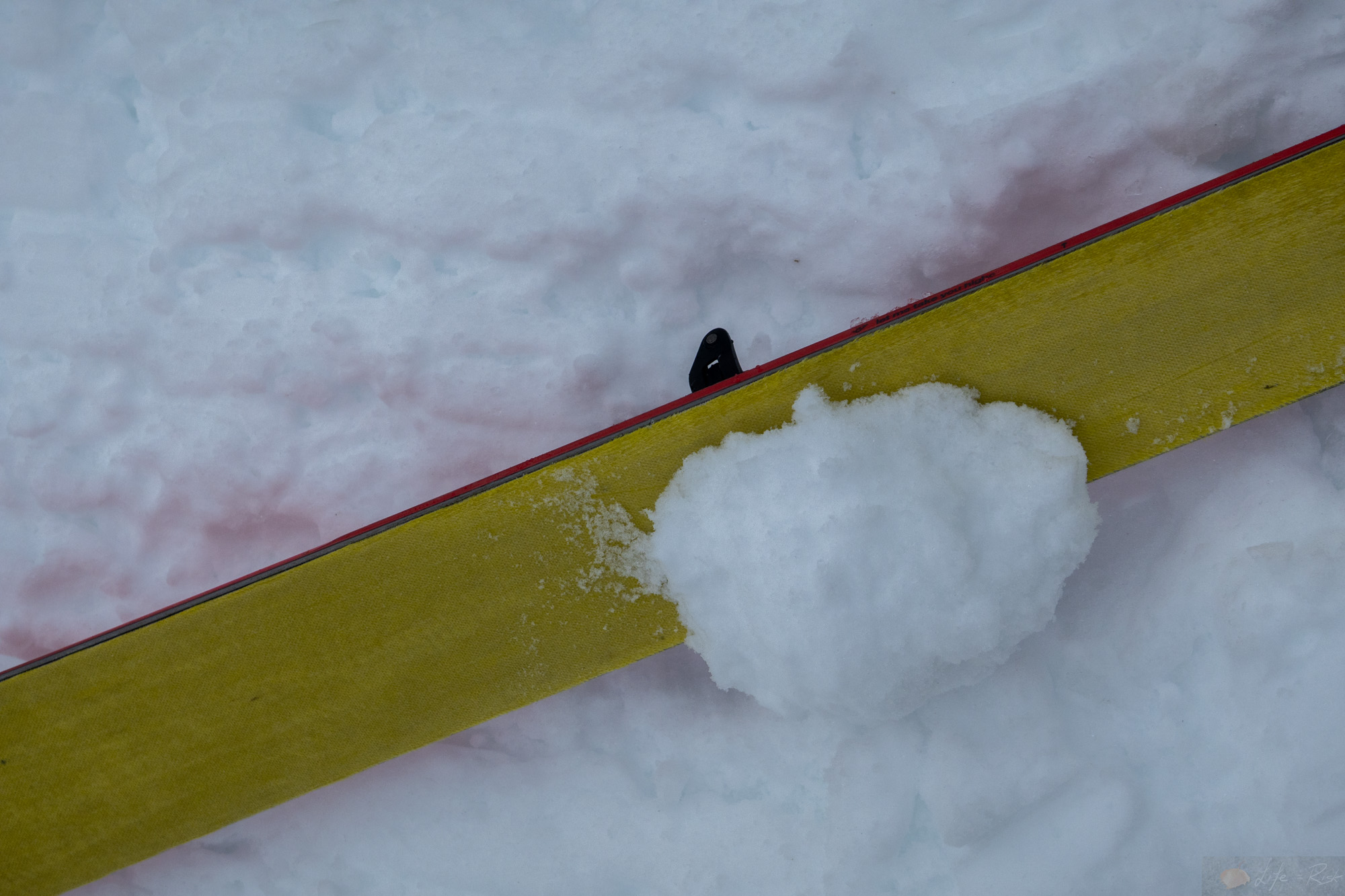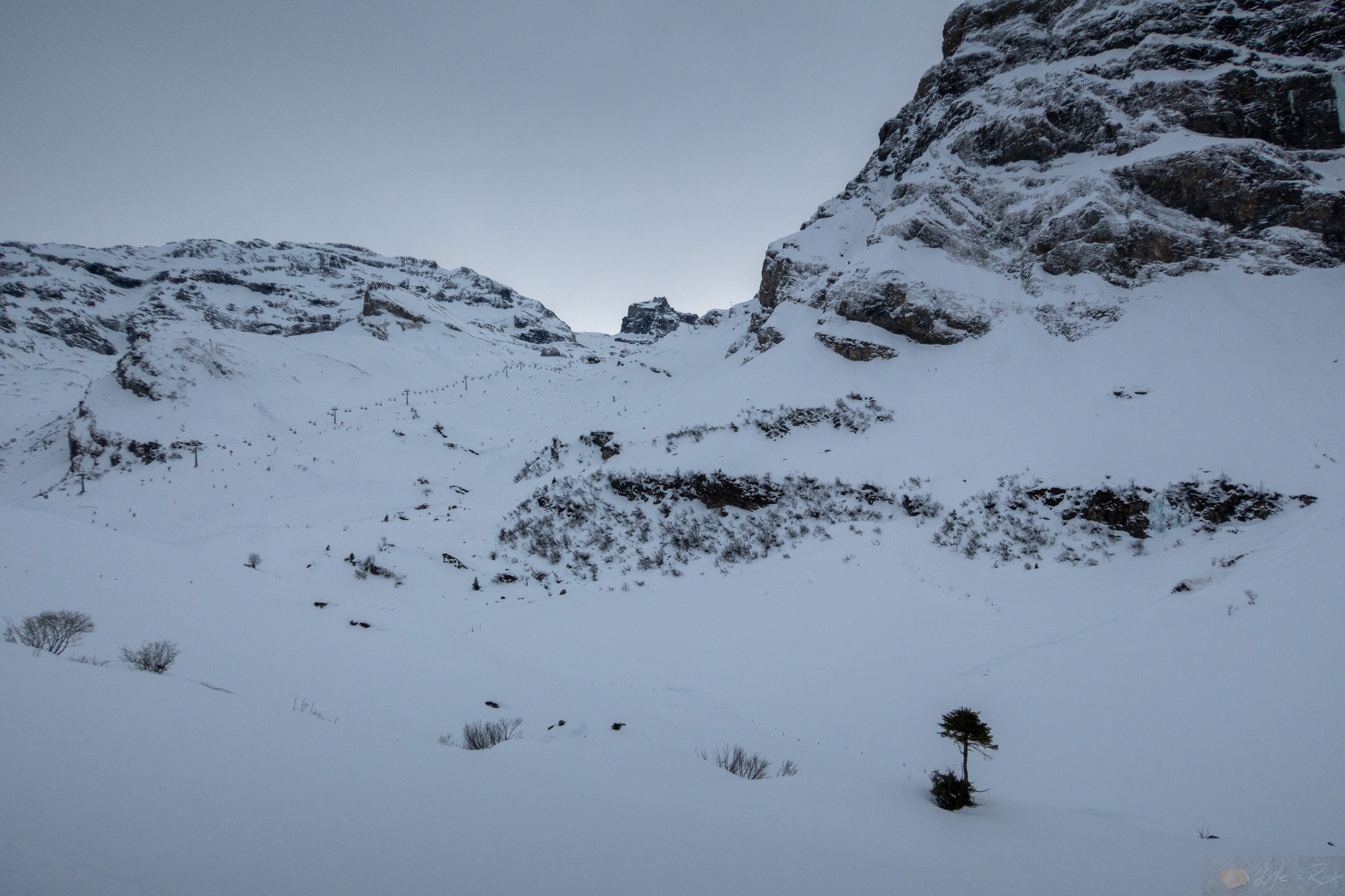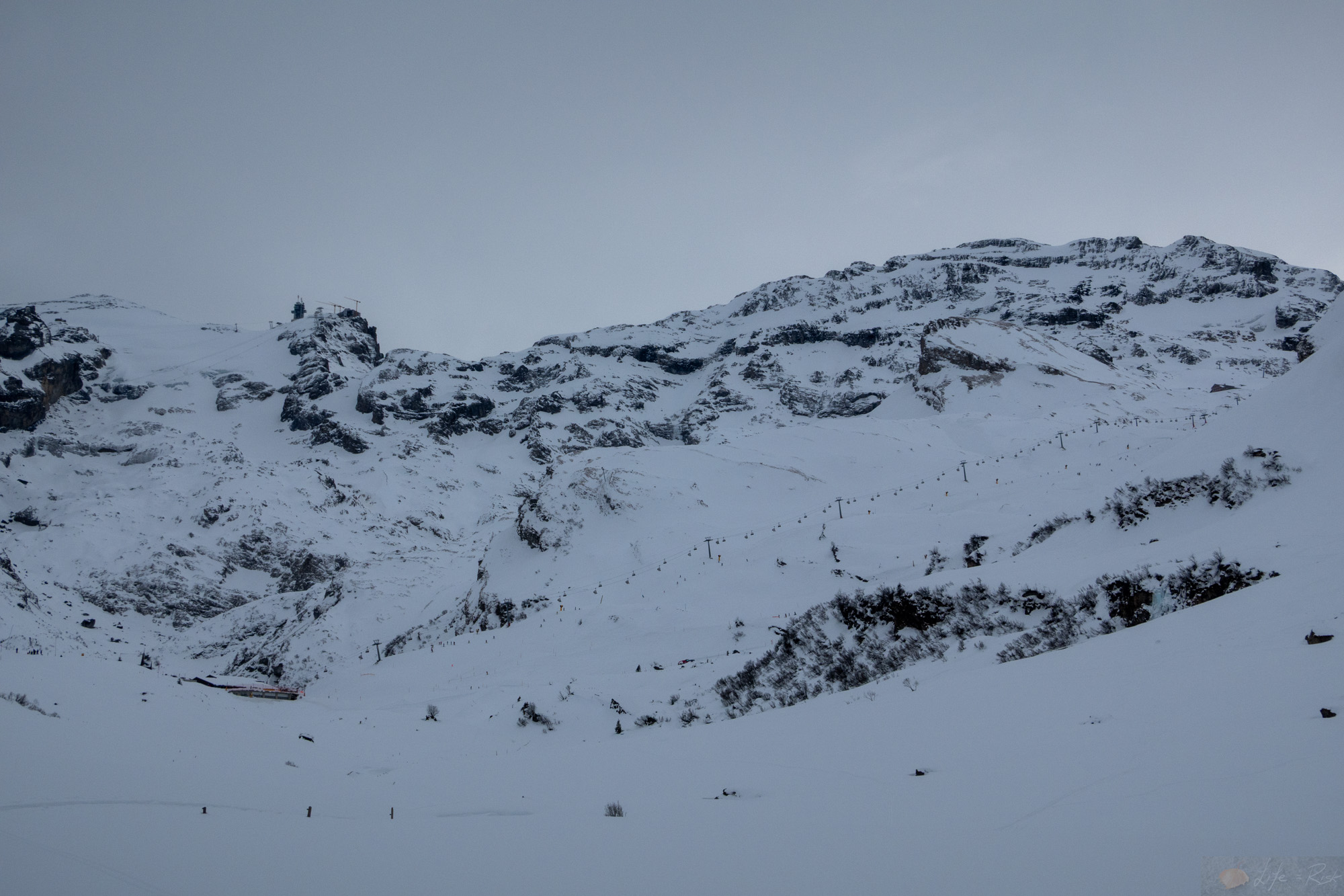 Zurück in Engelberg. Endlich. Auch hier gab es wenig bis gar keinen Schneefall. Für mich aktuell egal, aber dennoch. Tut mir schon etwas für die anderen Leid. Zum Glück blieb es wenigstens kalt, so dass der Schnee auf der Bahnseite vom Titlis in Takt war. Meine leichten Ski waren in der Reparatur bzw. die Bindung auf dem Weg zu ATK. Zum Glück hatte ich damals mit dem neuen Skischuh auch meine uralten Ski mit genommen und darauf anpassen lassen. Somit leisteten sie mir jetzt mal wieder gute Dienste obwohl sie gefühlt nen Kilo schwerer waren. Ich fellte an der Talstation auf und ging langsam los. Anfangs war ich noch irgendwie gehetzt. Meine Gedanken waren überall. Mit der Zeit kam ich wieder in den Rhythmus rein. Ich machte meine Fotos und genoss tatsächlich die bedeckte und etwas schwere Stimmung. Sie passte gerade perfekt. Insgesamt lief es ganz gut. Die Schuhe waren super und ich fühlte ich mich trotz schwererem Ski auch super. Leider wurde der Schnee dann kurz vor dem Kanonenrohr immer „künstlicher“ und pappiger. Das quittierte mein alte Fell damit, dass es zum Stollen anfing. Geil. Ich trat anfangs den Klumpen noch weg, aber irgendwann gings nicht mehr. Also Rucksack runter, nach dem Wachs kramen und das Fell wachsen. Funktionierte nicht gleich, aber nach dem dritten mal Wachsen war es dann ok. So konnte ich den Rest bis zum Trübsee hoch gehen. Ich war schon einigermaßen stolz als ich am Hopper ankam. Ich hätte nicht gedacht, dass ich das schaffe. Hier kurz umgezogen, dann rüber und runter. Warum auch immer verfolgte mich so nen Typ auf der Treppe runter rund es kamen zig leere Gondeln vorbei. Ich sprang noch in die letzte vor dem Flatterband rein, weil ich unbedingt alleine runter wollte und der Typ hinterher. Ich dachte mir nur WTF? Dann wollte er sich auch noch unterhalten und ich zog nur abweisend mein Buff über den Mund. Nicht, dass ich jetzt Angst vor Viren/Erkältung habe, aber es hat mich einfach genervt. Egal. Es war ein super Tag und mein Knie hält weiter und noch mehr.