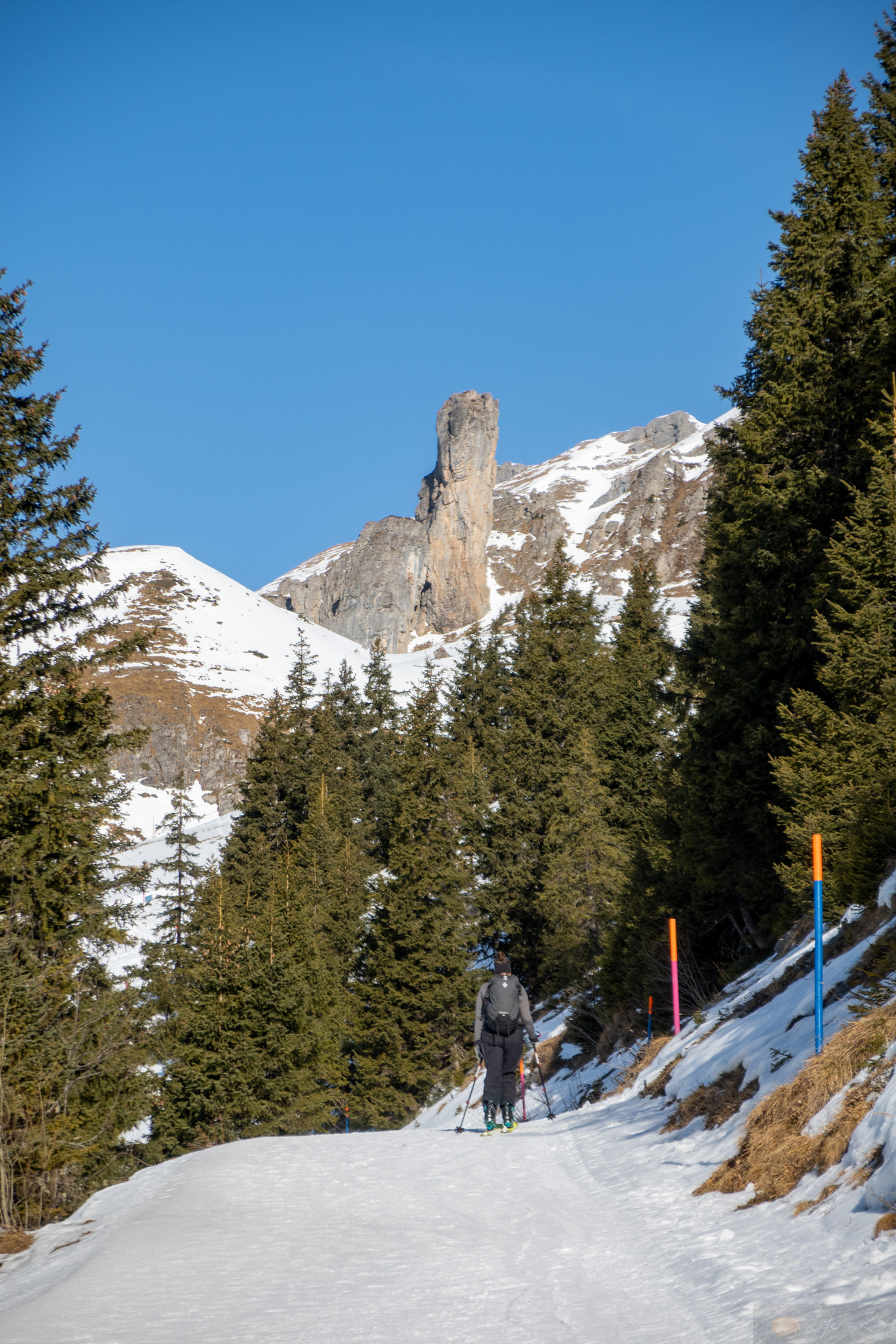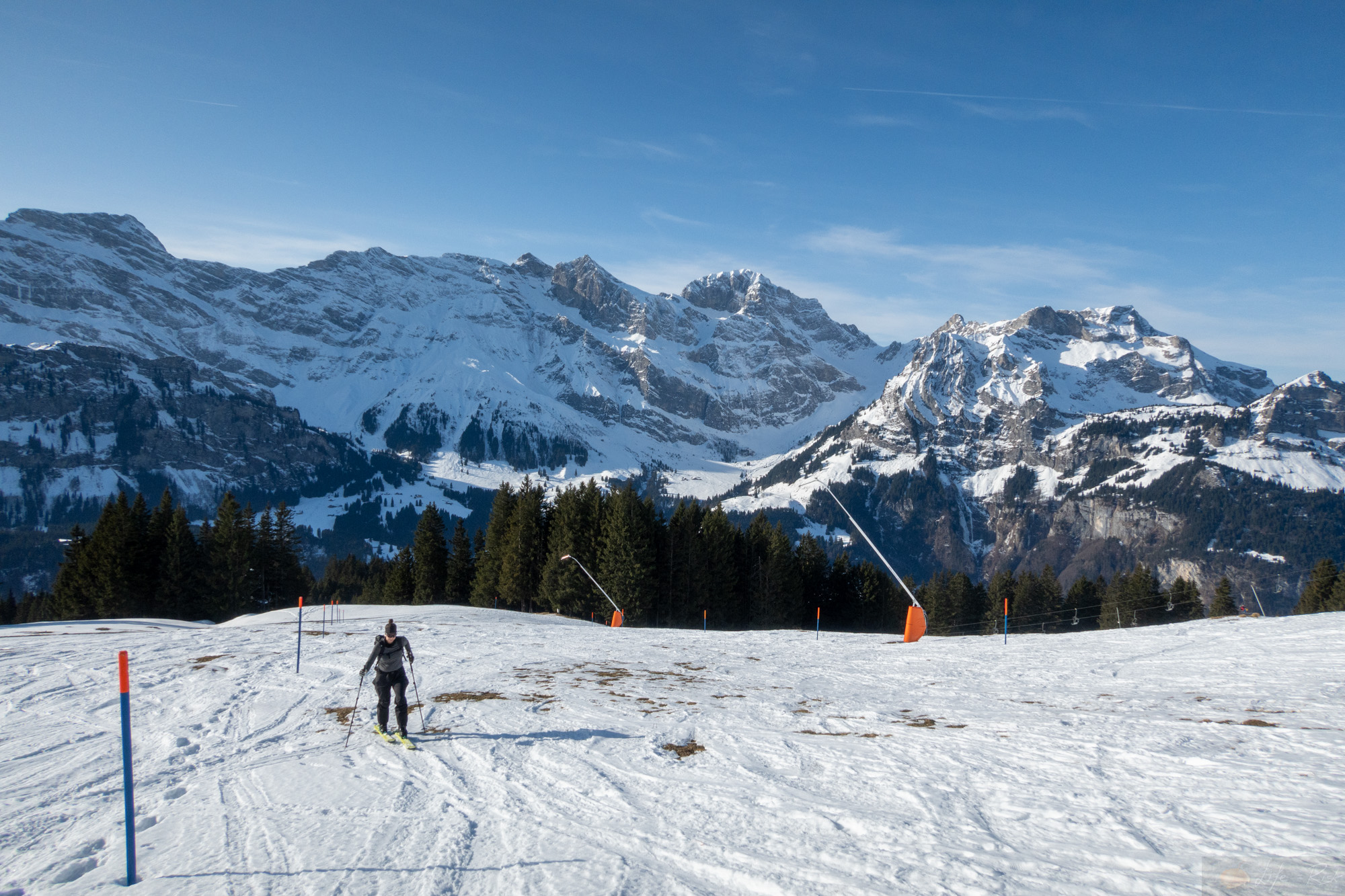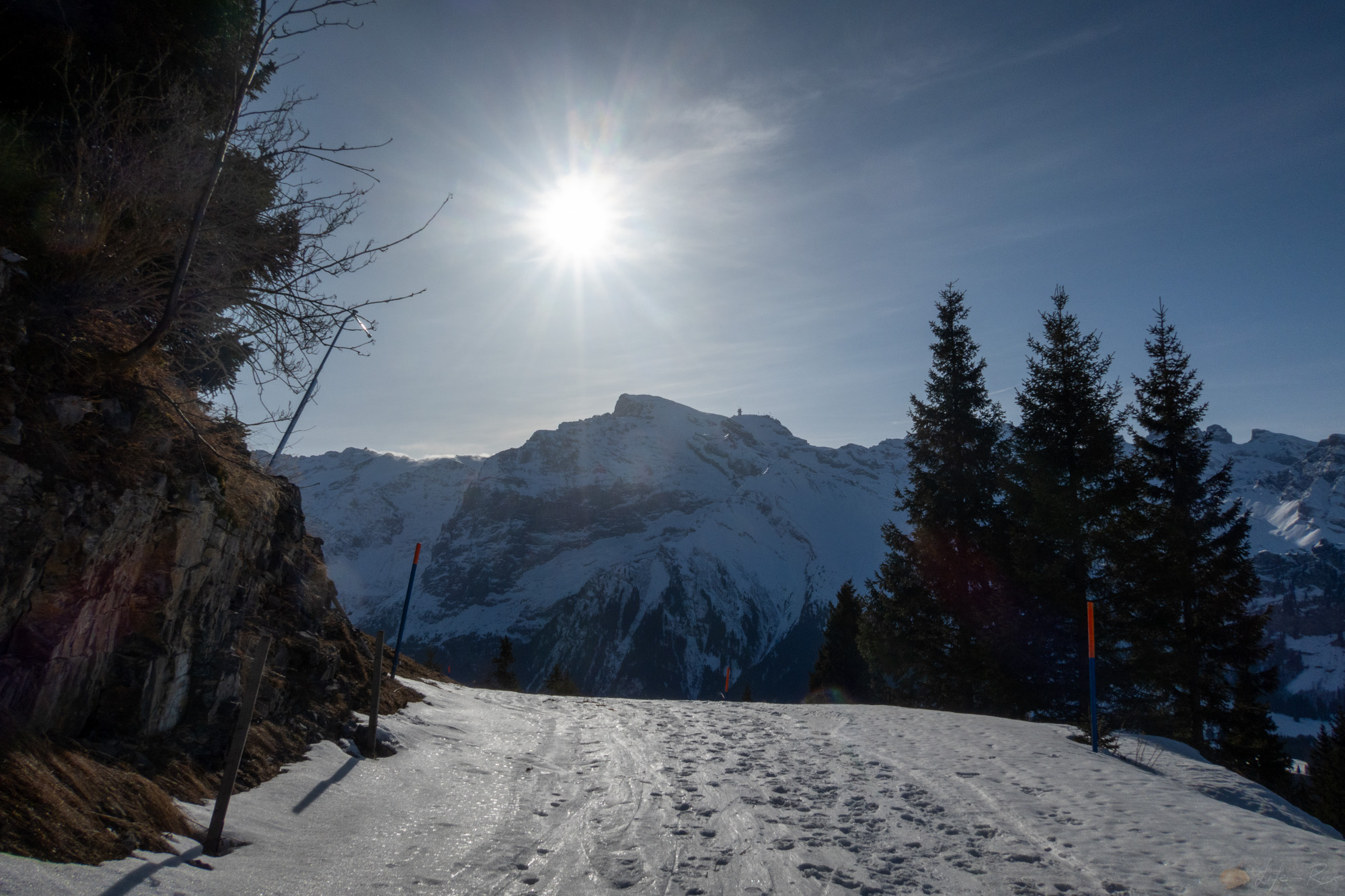 Heute gings wieder mit Laura auf die Südseite…auf zur Brunni. Wir packten unsere Ski, warteten auf den Skibus und fuhren vor bis zum Hahnenblick. Von hier dann bis Stand hoch und dann weiter. Tatsächlich fühlte es sich mittlerweile normal an. Also alles. Das im Schnee sein, dass Skitourengehen, dass Knie. Langsam ging es neben der Piste hoch. Die Sonne war draußen und man merkte insgesamt jetzt schon wie viel stärker sie geworden ist. Schwitzend suchte ich dann im Aufstieg irgendwann den Schatten. Bei einer Lücke in der Baumreihe blieb ich stehen und schaute rüber zum Hahnen…dieses Jahr? Vielleicht.