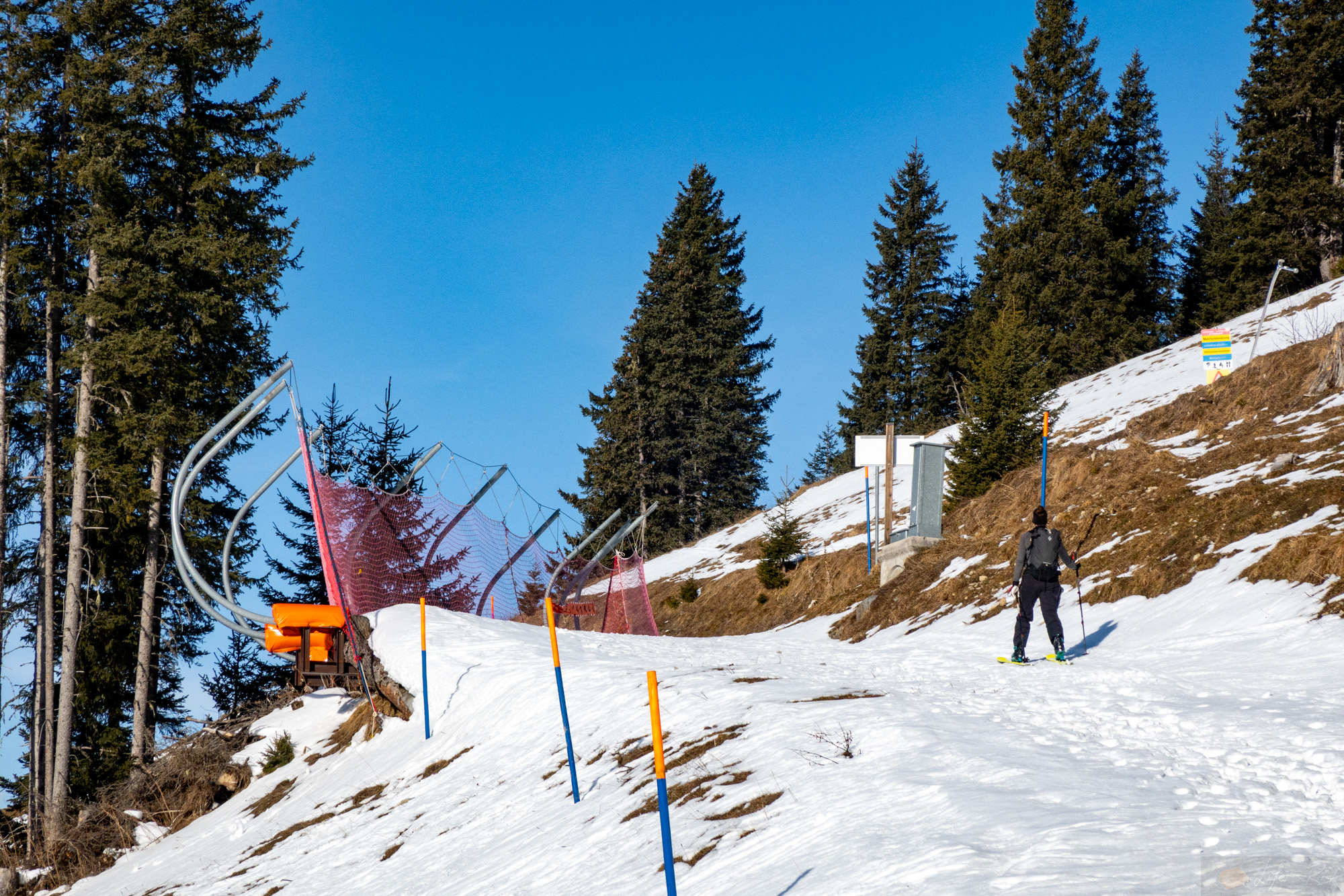 Danach gings weiter und ohne Probleme erreichten wir dann den Ziehweg/Winterwanderweg zur Brunni. Dieser war auch gleich geschafft und oben ergatterten wir noch einen Sitzplatz an den Holzbänken. Das war perfekt. Sonne im Gesicht, ich war komplett schwarz angezogen, meine Körper fühlte sich gut an. Dann die Holzwand hinter uns, die die Wärme nur so schluckte. Ich musste echt aufpassen nicht zu müde zu werden, denn Plan war schon nach unten zu fahren. So müde und ohne Spannung war das eine blöde Idee. So brachen wir fast schon unser Sonnenbad ab und machten uns auf. Laura wie immer vorne weg, ich langsam hinterher. Die Bedingungen waren anspruchsvoller, aber es ging gut. Ich fluchte zwar etwas als mich die Leute einfach immer wieder nah überholten, aber ohne Zwischenfälle kam ich unten an. Yeah…again. Eine Skitour mehr und das Knie hält. Ich will nicht sagen, dass es schon Normalität geworden ist, aber auch das fühlt sich gut an, wenn eine einfach Abfahrt nicht mehr „Oh mein Gott“ ist…so langsam wird’s.